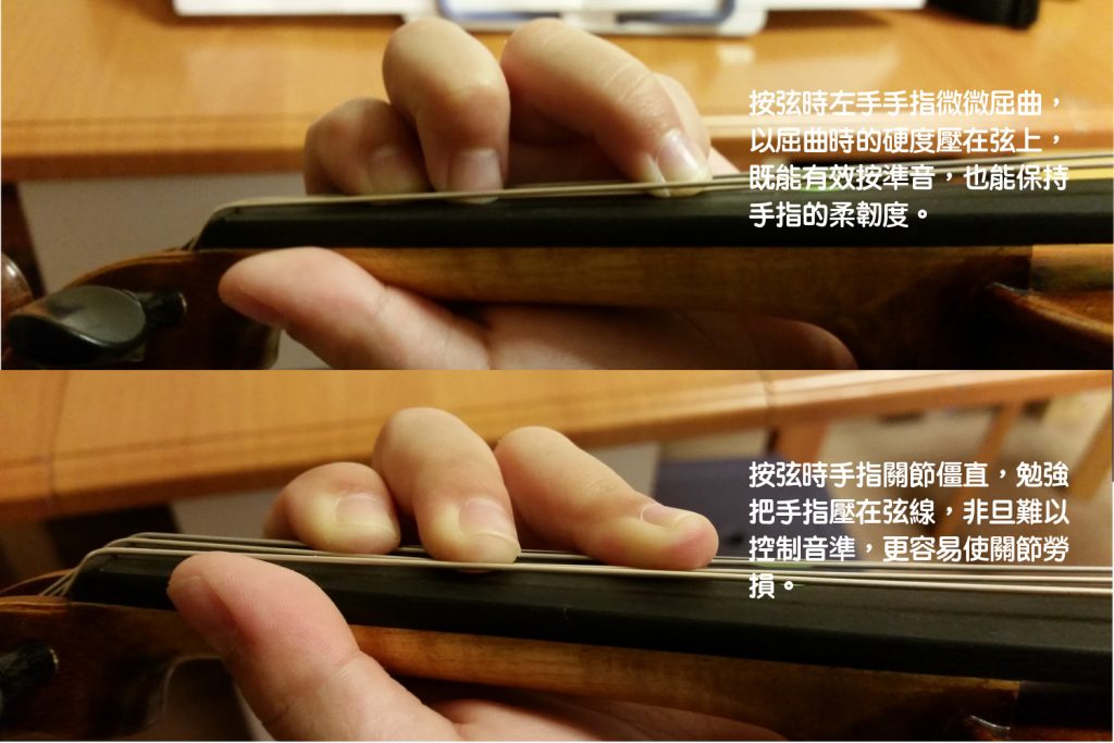 良好的姿勢其實是學好任何一樣樂器的首要法則,在學習小提琴的過程中,按弦的姿勢更會直接影響音準。按弦時左手手指屈曲起來,利用屈曲時的硬度按住弦線,而不是用死力將手指拉扯到弦線上面。初學者很多時都會因為用錯力,比正常花出更多力氣才把弦按好,這樣練下去既容易出現疲態,長遠也會引致關節勞損。