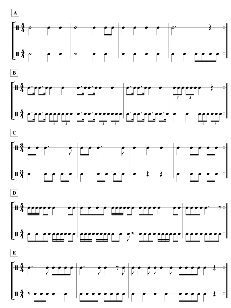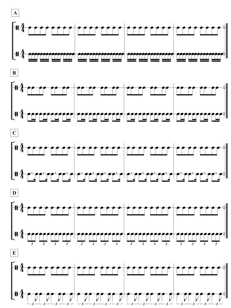 - 練習其中一方是固定一拍,另一方是其他固定節奏形的雙手節奏。