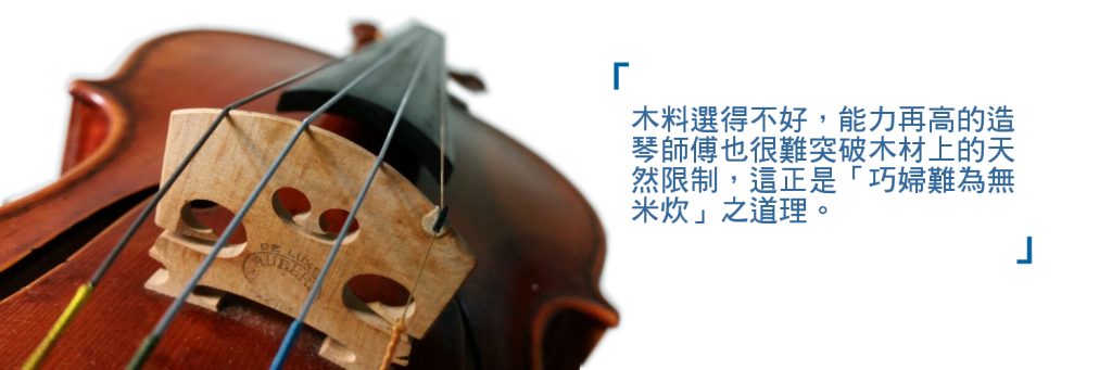 當然,單靠木紋分辨並不等於提琴就會有某程度的質素,因為就算有上乘木料,也得靠造琴師的工藝,再加上其他配件的配置(如低音樑、音柱、琴橋、甚至拉弦板的搭配),才能發揮木材應有的聲響效果和音色。但相反,木料選得不好,能力再高的造琴師傅也很難突破木材上的天然限制,這正是「巧婦難為無米炊」之道理。