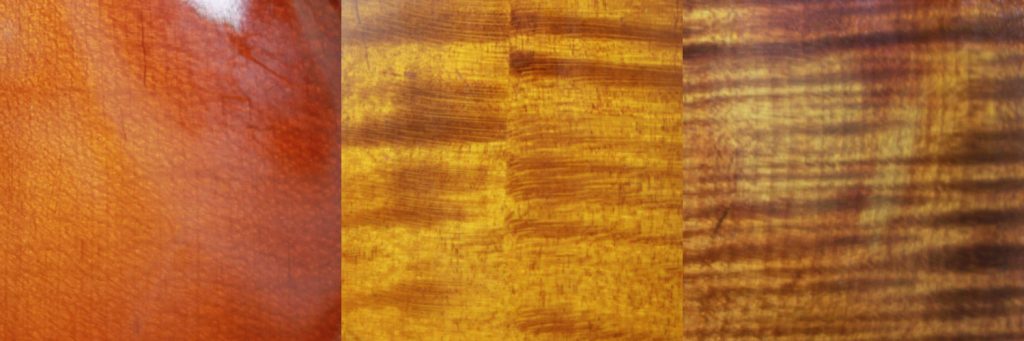 底板和側板用的楓木木紋較為複雜,除了可以看見徑切的直紋外,很多時更會看到呈橫向的虎皮紋,而這些木紋往往比直向的木紋更深刻,優質的楓木料木紋鮮明和具立體感,但這些木紋並非由年輪所產生的木紋,只有直向的木紋才是年輪產生的木紋,所以背板除了看看橫紋美觀與否,也要不忘仔細看看直向木紋的紋理,但通常這些直紋沒有雲杉那縻規則和畢直。值得一提的是:楓木板除了有虎皮紋外,還可以能出現雲狀或雀眼形態的木紋,所以每部提琴的琴背都有獨特的木紋。以下兩幅相反映了三個不同檔次的小提琴(左至右:1. 數百元的普及琴;2. 約3,000元的工作室提琴;3. 約30,000元的工作室提琴),所有用底面料木紋的分別,以供參考。