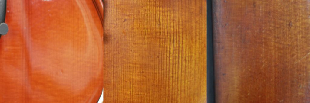 造小提琴的木材主要是杉木和楓木,配件則有用烏木、棗木、黃揚木等木材,琴身是整部琴的核心,所以我們先了解琴身所用的木。提琴面板一般用雲杉(Spruce),底板和側板用楓木(Maple),所以一般來說底面木紋都不相同,面板的雲杉的木紋呈直向條紋,這是雲杉實木徑切(註)後得出的木紋,一般來說木紋越密越好,但木紋的密度並非反映木頭的生長年齡,因為在切割木材時,也要得看徑切時的角度,不同的切割角度也會影響木紋的疏密。其次就是要看木紋的直度,上乘的木料能見到絕大部份的木紋走向是畢直的,只有接近上下兩端,才可能呈現微微向內彎,但這雨端往往都會被指板和腮托所遮蔽,所以通常在提琴未裝上配件的情況下,才能仔細觀察這兩端的木紋。一般而言,琴面露出的部份,木紋呈現均勻、細緻、平衡而畢直的話,已算是不太差的木料。
